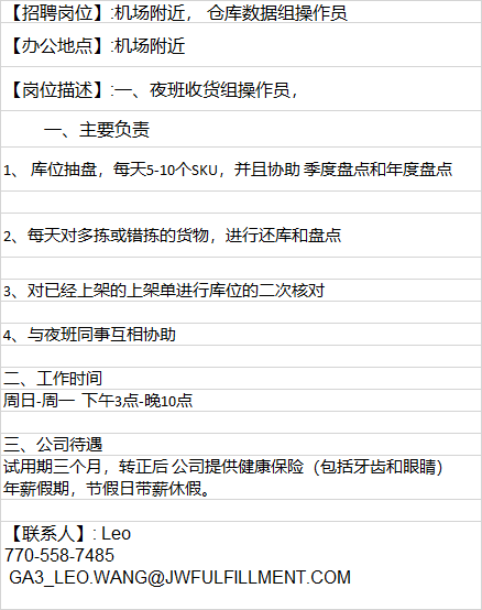 JW FULFILLMENT ATL 诚聘 仓库数据组操作员